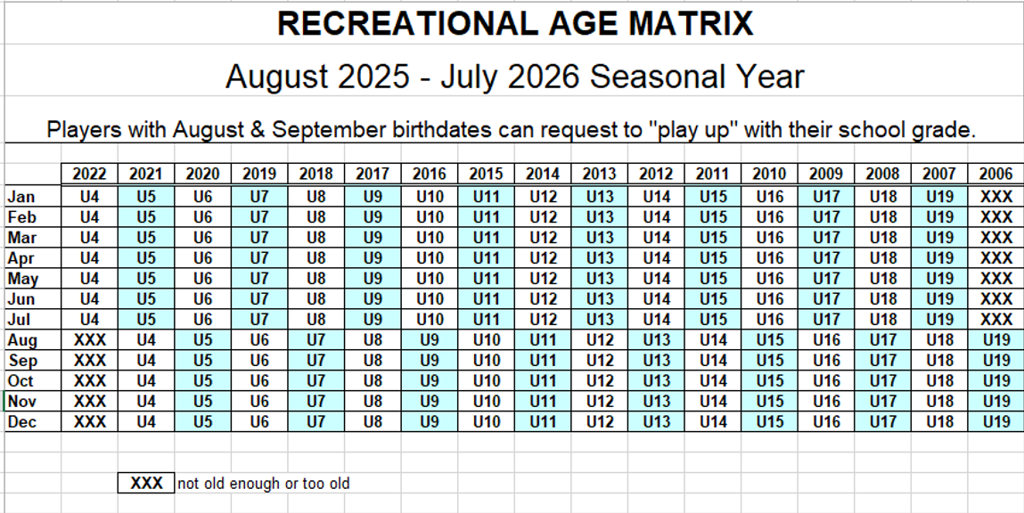 The Fall 2025 – Spring 2026 seasonal year runs from August 1, 2025 – July 31, 2026. Please check the Age Matrix below to see which age group your child will be placed into based on their birthdate.